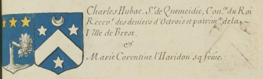 1713 : mariage à Brest Les-Sept-Saints de demoiselle Madeleine de la Maison Gommery et noble homme Vincent L'Haridon, sieur de Kerallain, écrivain de la Marine.